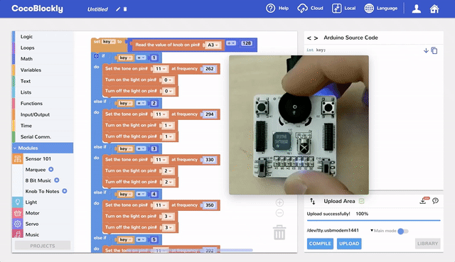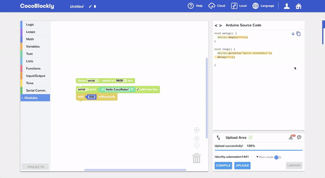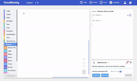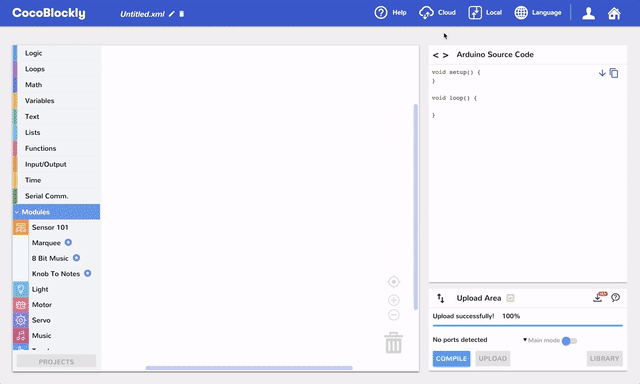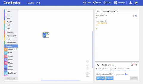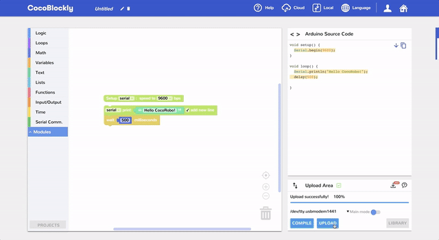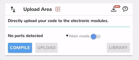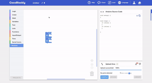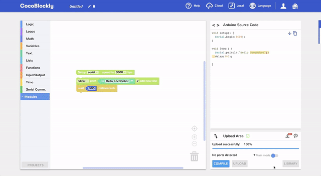 (Main Mode) Upload Code: Under Main Mode, CocoBlockly will only detect Main Controller Module, and you will be able to upload the main mode code to the module. If you are using WiFi Module, the interface will automatically change to WiFi Mode.